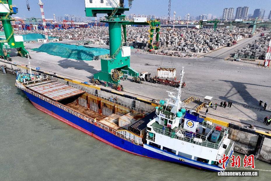 2月3日,伴随着2026年春运的启动,福建厦门海翔码头迎来厦金“小三通”货运航线春运首班互通班轮“进薪轮”。厦门东渡边检站移民管理警察高效办结边检手续,同步送上春联、中国结等新春礼包,以“零延时通关+温情服务”双重保障,拉开两岸年货物资跨海流通的温暖序幕。不远处的“闽台船员驿站”内,两岸同胞围坐畅谈,“两岸一家亲,闽台亲上亲”的心声道出共同期盼,驿站内政策咨询专窗、绿色通道与闽南乡音服务,让台湾船员真切感受到“家的温暖”。自厦门翔安至金门新货运通道开通以来,凌晨还在福建宁德海域活蹦乱跳的深海大黄鱼,上午即抵厦门海翔码头装船,经边检“零延时”通关,当晚便能鲜抵台湾餐桌,这是两岸民生相通、经济相融的鲜活脉搏。图为从金门驶来的“进薪轮”在厦门海翔码头卸货。(无人机照片)中新社记者 摄