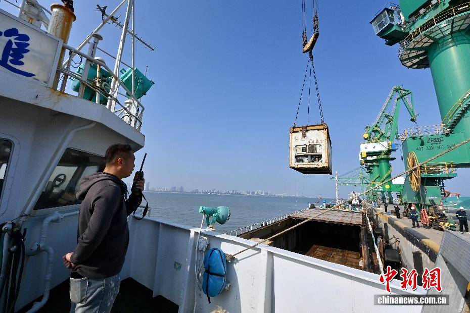 2月3日,伴随着2026年春运的启动,福建厦门海翔码头迎来厦金“小三通”货运航线春运首班互通班轮“进薪轮”。厦门东渡边检站移民管理警察高效办结边检手续,同步送上春联、中国结等新春礼包,以“零延时通关+温情服务”双重保障,拉开两岸年货物资跨海流通的温暖序幕。不远处的“闽台船员驿站”内,两岸同胞围坐畅谈,“两岸一家亲,闽台亲上亲”的心声道出共同期盼,驿站内政策咨询专窗、绿色通道与闽南乡音服务,让台湾船员真切感受到“家的温暖”。自厦门翔安至金门新货运通道开通以来,凌晨还在福建宁德海域活蹦乱跳的深海大黄鱼,上午即抵厦门海翔码头装船,经边检“零延时”通关,当晚便能鲜抵台湾餐桌,这是两岸民生相通、经济相融的鲜活脉搏。图为台湾船员在船上用对讲机遥控卸货。中新社记者 摄