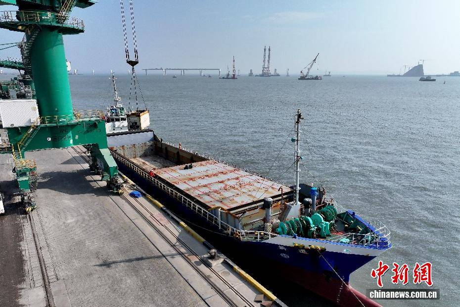 2月3日,伴随着2026年春运的启动,福建厦门海翔码头迎来厦金“小三通”货运航线春运首班互通班轮“进薪轮”。厦门东渡边检站移民管理警察高效办结边检手续,同步送上春联、中国结等新春礼包,以“零延时通关+温情服务”双重保障,拉开两岸年货物资跨海流通的温暖序幕。不远处的“闽台船员驿站”内,两岸同胞围坐畅谈,“两岸一家亲,闽台亲上亲”的心声道出共同期盼,驿站内政策咨询专窗、绿色通道与闽南乡音服务,让台湾船员真切感受到“家的温暖”。自厦门翔安至金门新货运通道开通以来,凌晨还在福建宁德海域活蹦乱跳的深海大黄鱼,上午即抵厦门海翔码头装船,经边检“零延时”通关,当晚便能鲜抵台湾餐桌,这是两岸民生相通、经济相融的鲜活脉搏。图为“进薪轮”在厦门海翔码头装货,远处便是正在建设中的厦金大桥(厦门段)。(无人机照片)中新社记者 摄