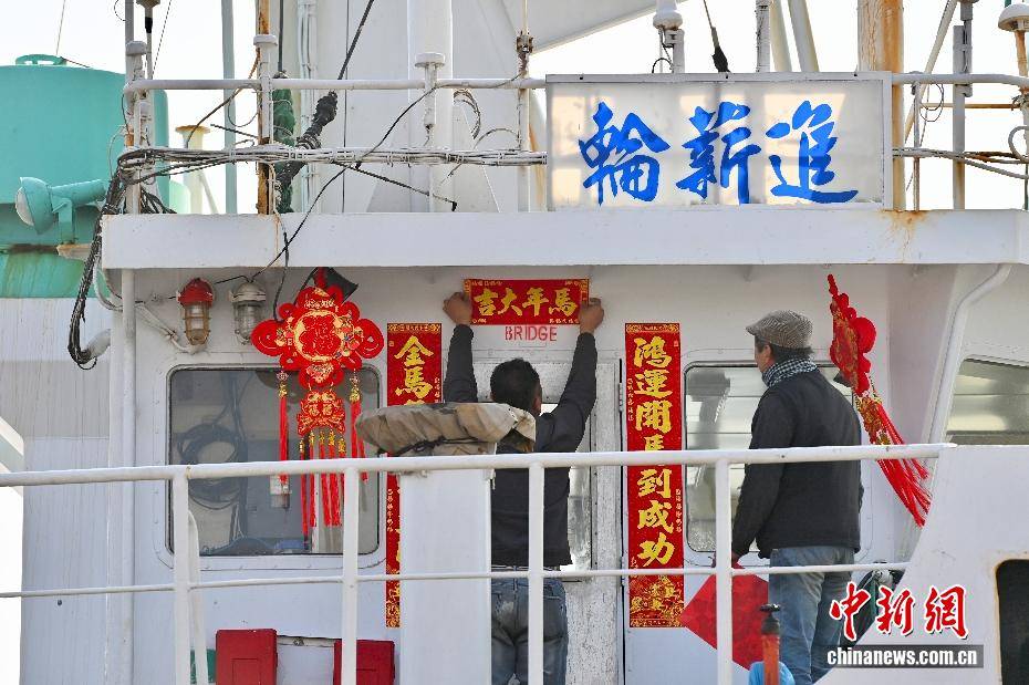 2月3日,伴随着2026年春运的启动,福建厦门海翔码头迎来厦金“小三通”货运航线春运首班互通班轮“进薪轮”。厦门东渡边检站移民管理警察高效办结边检手续,同步送上春联、中国结等新春礼包,以“零延时通关+温情服务”双重保障,拉开两岸年货物资跨海流通的温暖序幕。不远处的“闽台船员驿站”内,两岸同胞围坐畅谈,“两岸一家亲,闽台亲上亲”的心声道出共同期盼,驿站内政策咨询专窗、绿色通道与闽南乡音服务,让台湾船员真切感受到“家的温暖”。自厦门翔安至金门新货运通道开通以来,凌晨还在福建宁德海域活蹦乱跳的深海大黄鱼,上午即抵厦门海翔码头装船,经边检“零延时”通关,当晚便能鲜抵台湾餐桌,这是两岸民生相通、经济相融的鲜活脉搏。图为即将离港前,台湾船员将春联和中国结等新春饰品挂在驾驶舱外。中新社记者 摄