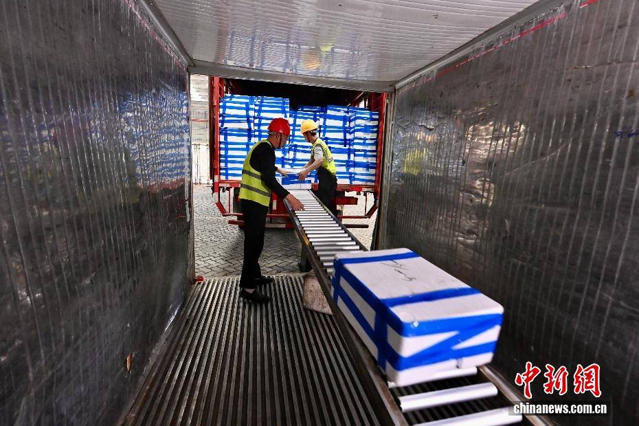 2月3日,伴随着2026年春运的启动,福建厦门海翔码头迎来厦金“小三通”货运航线春运首班互通班轮“进薪轮”。厦门东渡边检站移民管理警察高效办结边检手续,同步送上春联、中国结等新春礼包,以“零延时通关+温情服务”双重保障,拉开两岸年货物资跨海流通的温暖序幕。不远处的“闽台船员驿站”内,两岸同胞围坐畅谈,“两岸一家亲,闽台亲上亲”的心声道出共同期盼,驿站内政策咨询专窗、绿色通道与闽南乡音服务,让台湾船员真切感受到“家的温暖”。自厦门翔安至金门新货运通道开通以来,凌晨还在福建宁德海域活蹦乱跳的深海大黄鱼,上午即抵厦门海翔码头装船,经边检“零延时”通关,当晚便能鲜抵台湾餐桌,这是两岸民生相通、经济相融的鲜活脉搏。图为工人在码头货仓内将大黄鱼转运至运往台湾的集装箱里。中新社记者 摄
