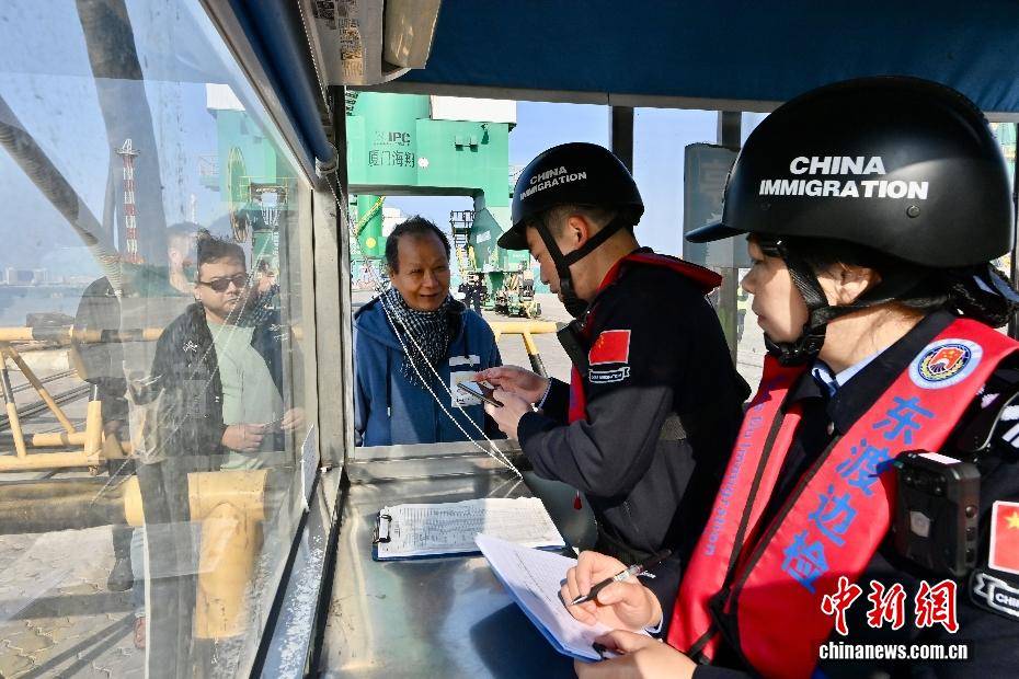 2月3日,伴随着2026年春运的启动,福建厦门海翔码头迎来厦金“小三通”货运航线春运首班互通班轮“进薪轮”。厦门东渡边检站移民管理警察高效办结边检手续,同步送上春联、中国结等新春礼包,以“零延时通关+温情服务”双重保障,拉开两岸年货物资跨海流通的温暖序幕。不远处的“闽台船员驿站”内,两岸同胞围坐畅谈,“两岸一家亲,闽台亲上亲”的心声道出共同期盼,驿站内政策咨询专窗、绿色通道与闽南乡音服务,让台湾船员真切感受到“家的温暖”。自厦门翔安至金门新货运通道开通以来,凌晨还在福建宁德海域活蹦乱跳的深海大黄鱼,上午即抵厦门海翔码头装船,经边检“零延时”通关,当晚便能鲜抵台湾餐桌,这是两岸民生相通、经济相融的鲜活脉搏。图为厦门东渡边检站民警在码头为台湾船员办理通关手续。中新社记者 摄